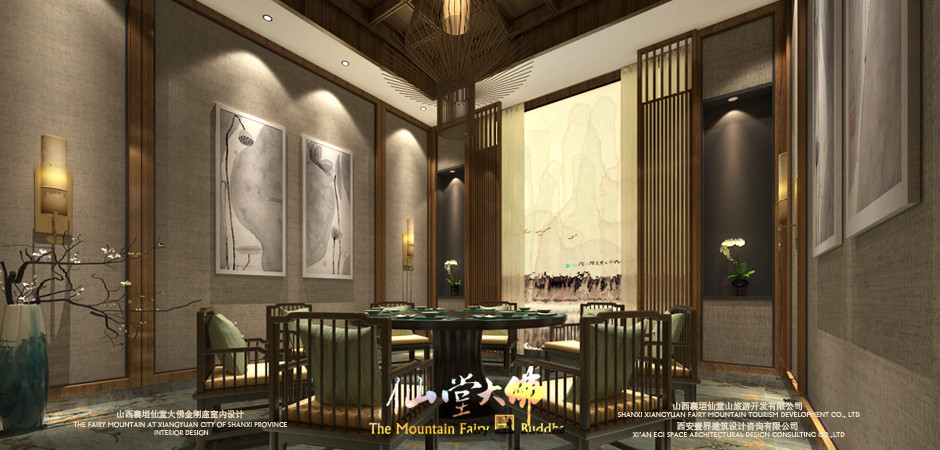 本案位于仙堂山景区主峰峰顶高59米的“世界第一露天青铜坐佛---仙堂大佛”的须弥座(金刚座)内。此次室内设计的主要空间有须弥宝殿、供奉厅、法物流通街、素食斋、开光厅、博物馆、贵宾接待厅共七个空间。
