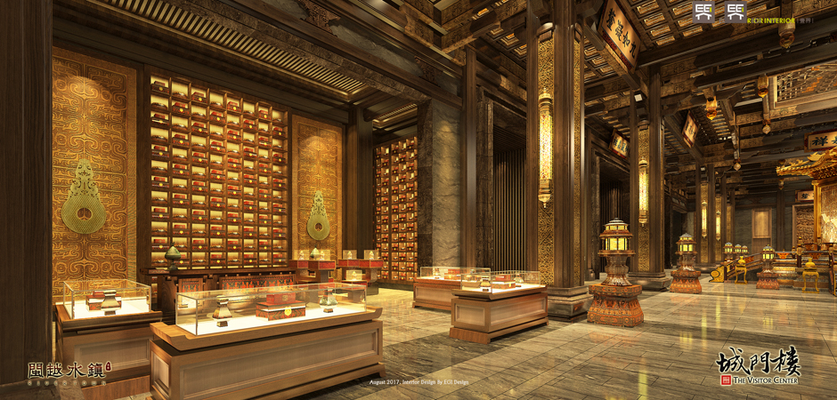 城门楼承载着闽越水镇文化景区的形象展示、文化展示、精品展示、旅游咨询的重要意义,充分展示着福建当地历史文化与地域文化。其中闽越文化中的茉莉花、万岁瓦当、蛇图腾、青铜剑、编钟、人俑、服饰等元素具有鲜明的地域和文明特色。我们也将这些元素巧妙的运用于室内设计中,再结合明清建筑风格的简洁,形成"大气而包容、浑厚而温和、精练而雅致"的设计理念。