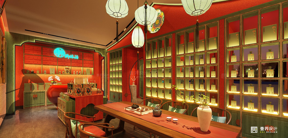 【柳林展厅】以盛唐的浓郁色彩为设计元素,结合霓虹灯字代入赛博朋克感呈现,与古都氛围完美契合,结合色彩的同时也按照唐代家具的制式进行了现代演绎,营造了浓厚大唐底蕴且不失当代潮流感的酒文化展厅。
