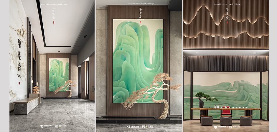 一入接待前厅,映入眼帘的木质亭台艺术品恰好呼应了对"翠景台"意境想象,与服务台相对应的一面,卢甫圣大师苍翠的山峦艺术画也完美呼应了主题。